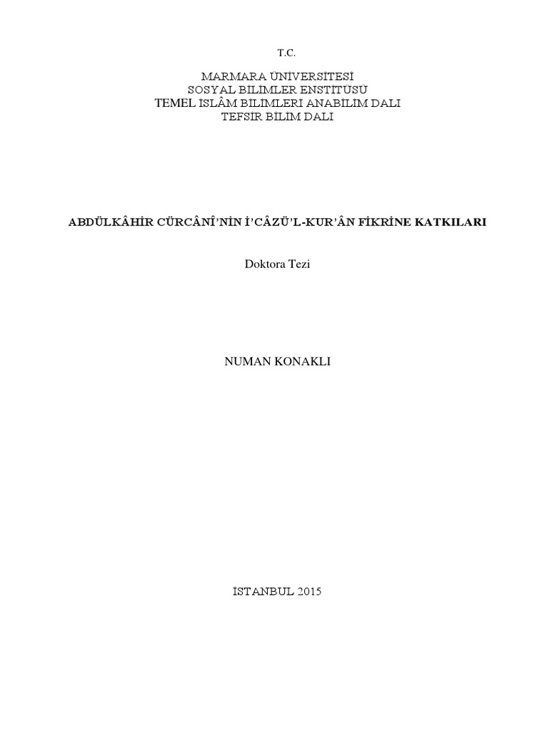 Belagat Abdulkahir Curcani Nin I Cazu L Kur An Fikrine Katkilari 323s Tez Numan Konakli Dns Yakup Cicek 20145 Marmara Uni